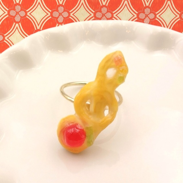 レトロなト音記号の形の、絞り出しクッキーの指輪です♪ クッキーにレトロなドレンチェリーとアンゼリカ、カラフルなフルーツゼリーをトッピング。 指先から甘い香りがふんわり漂ってきそう♪ ------【サイズ】--------- モチーフの大きさ(クッキー) 約2.9cm×1.1cm リングサイズ フリー(調節可) ------【素材】----------- 樹脂粘土、樹脂、合金 ------【送料】----------- ①定形外郵便 全国一律 ¥140 ポスト投函です。土日の配達はお休みです。日時指定はできません。 ②ゆうパケット 全国一律 ¥360 ポスト投函です。土日の配達があるので定形外郵便より早く届きます。日時指定はできません。 ③宅急便コンパクト(ヤマト運輸) ¥650〜 一番早く届きます。お届け先によって送料が変わります。日時指定ができます。 ¥7,000以上のお買い物で送料無料になります。 ------【ラッピング】----- プレゼントとしてご注文の場合、簡単なラッピング(お渡し用の紙袋付き)を無料で承ります。 ご希望の方はオプションからお選びください。 ご注文のお客さまにも、中身が見える状態でお届けいたします♪ ------【お知らせ】------- ◇定形外郵便、ゆうパケットをご選択いただいた場合、お届けの日時指定はできませんのでご了承ください。 BASEのシステム上、どの発送方法をお選びただいた場合でも日時の選択ができてしまいますが、日時指定なしで発送させていただきます。 日時指定をご希望の方は宅急便コンパクトをご利用ください。 ◇海外配送も承ります。日本郵便のEMSを利用、一部お届けできない国がありますのでご不明な場合はご注文前にお問い合わせください。 ◇モチーフはパーツから全て手作りしています。形や大きさ等、個体差がありますのでご了承ください。 ◇細かいつくりになっていますので、お取り扱いにご注意ください。