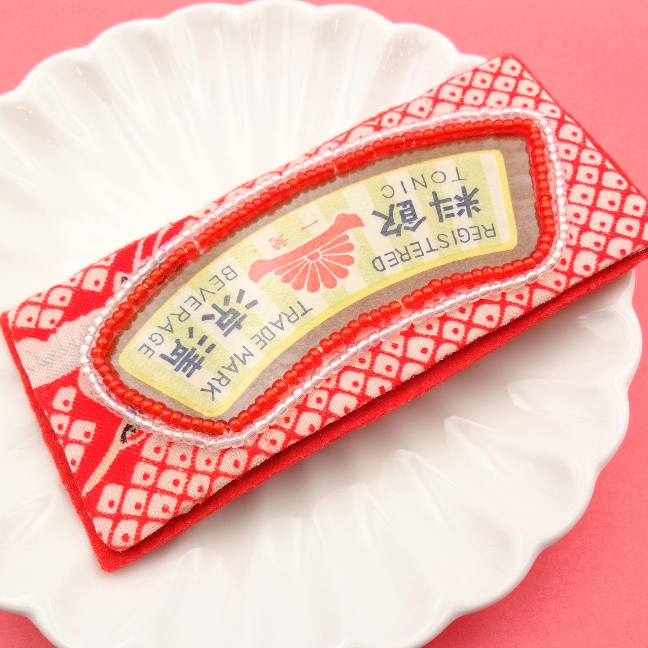 ドリンクラベルに透明のカバーをかぶせ、周りをぐるっとビーズ刺繍で飾りました。