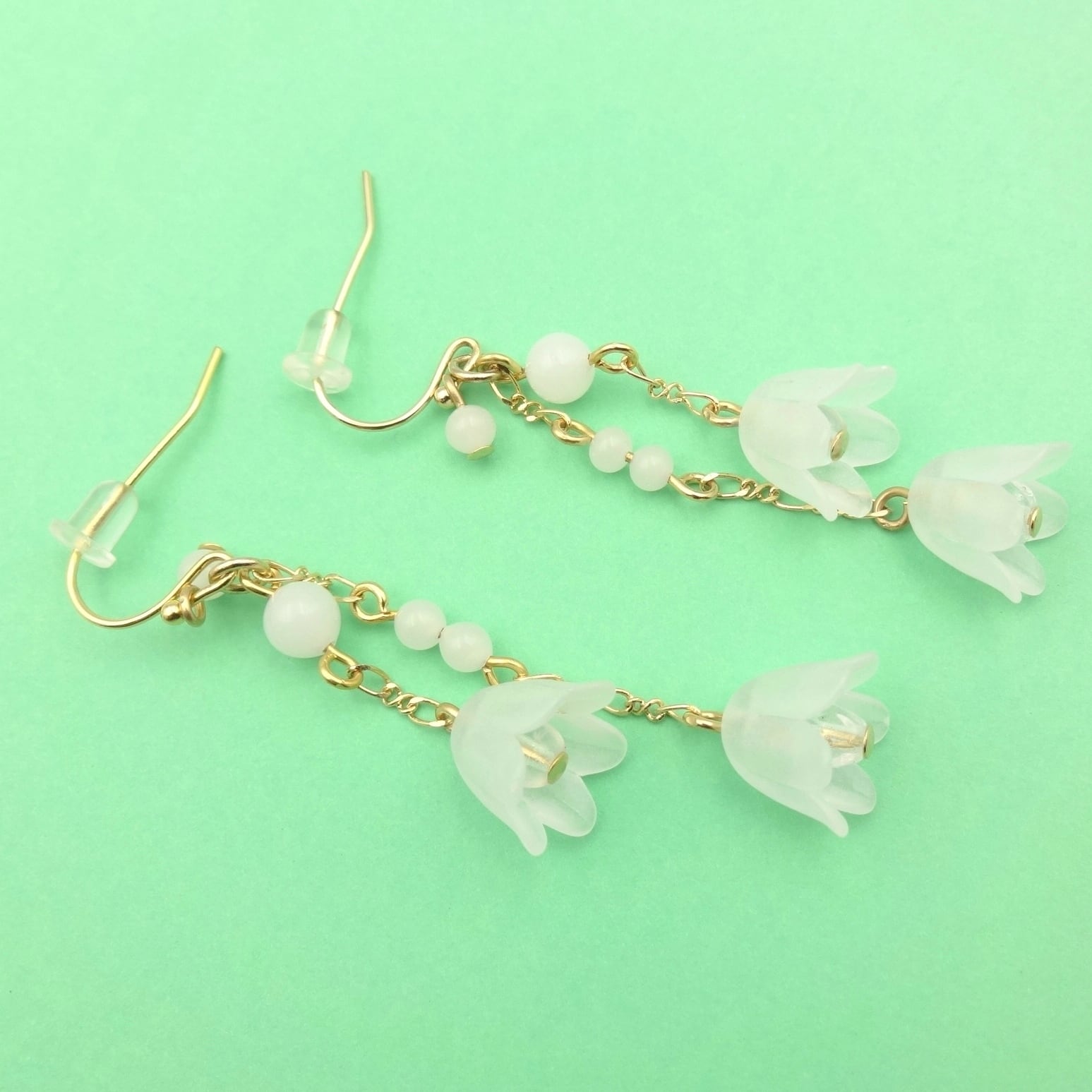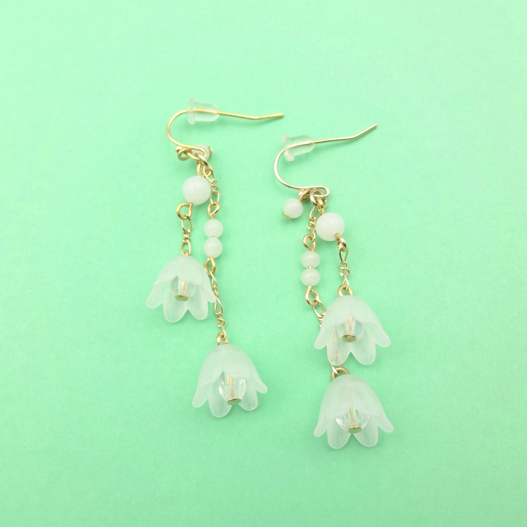 すずらんのモチーフにガラスビーズをあわせた耳飾りです♪