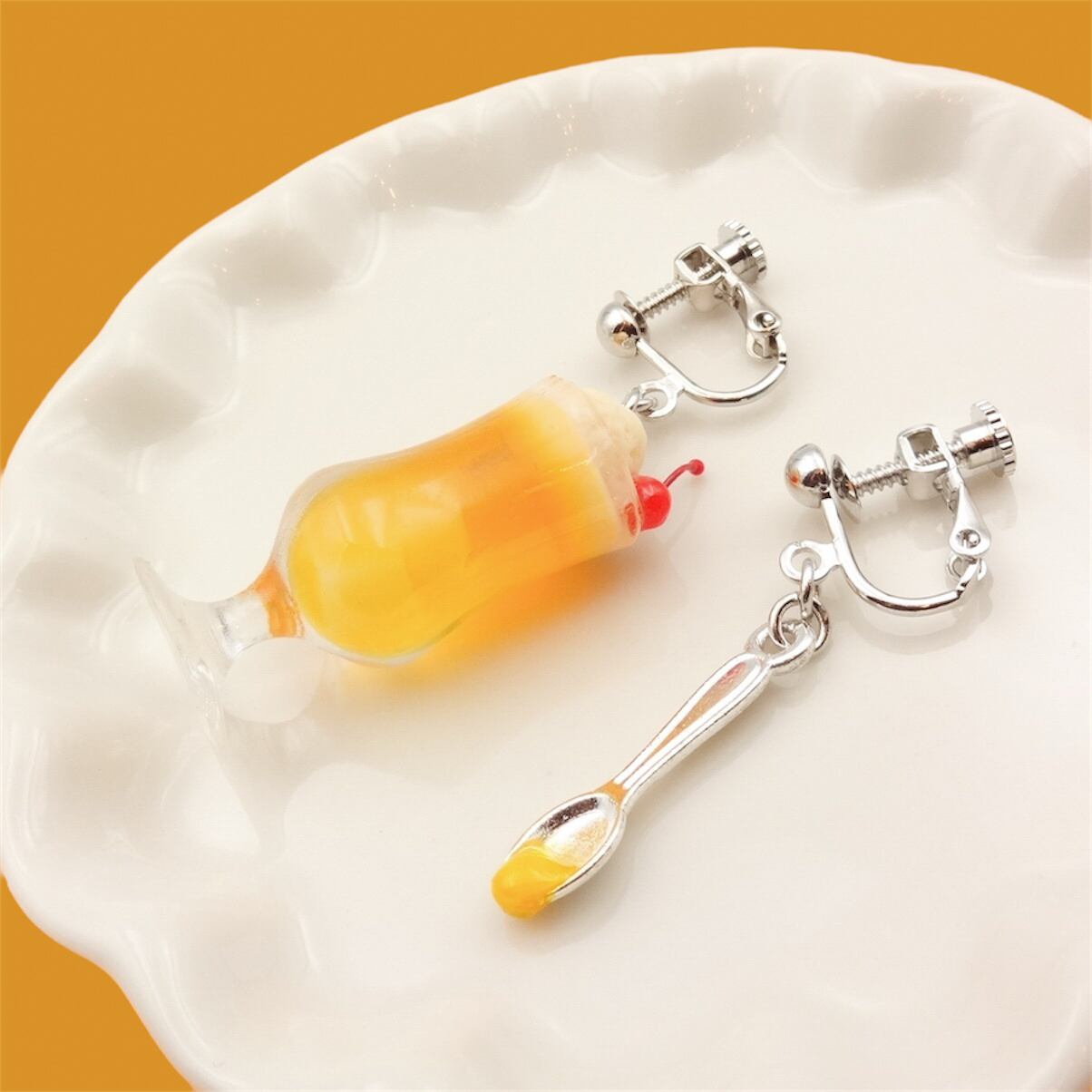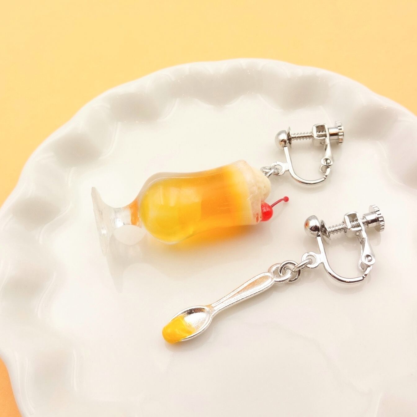 レトロなグラスを使ったミカンのクリームソーダの耳飾りです♪
