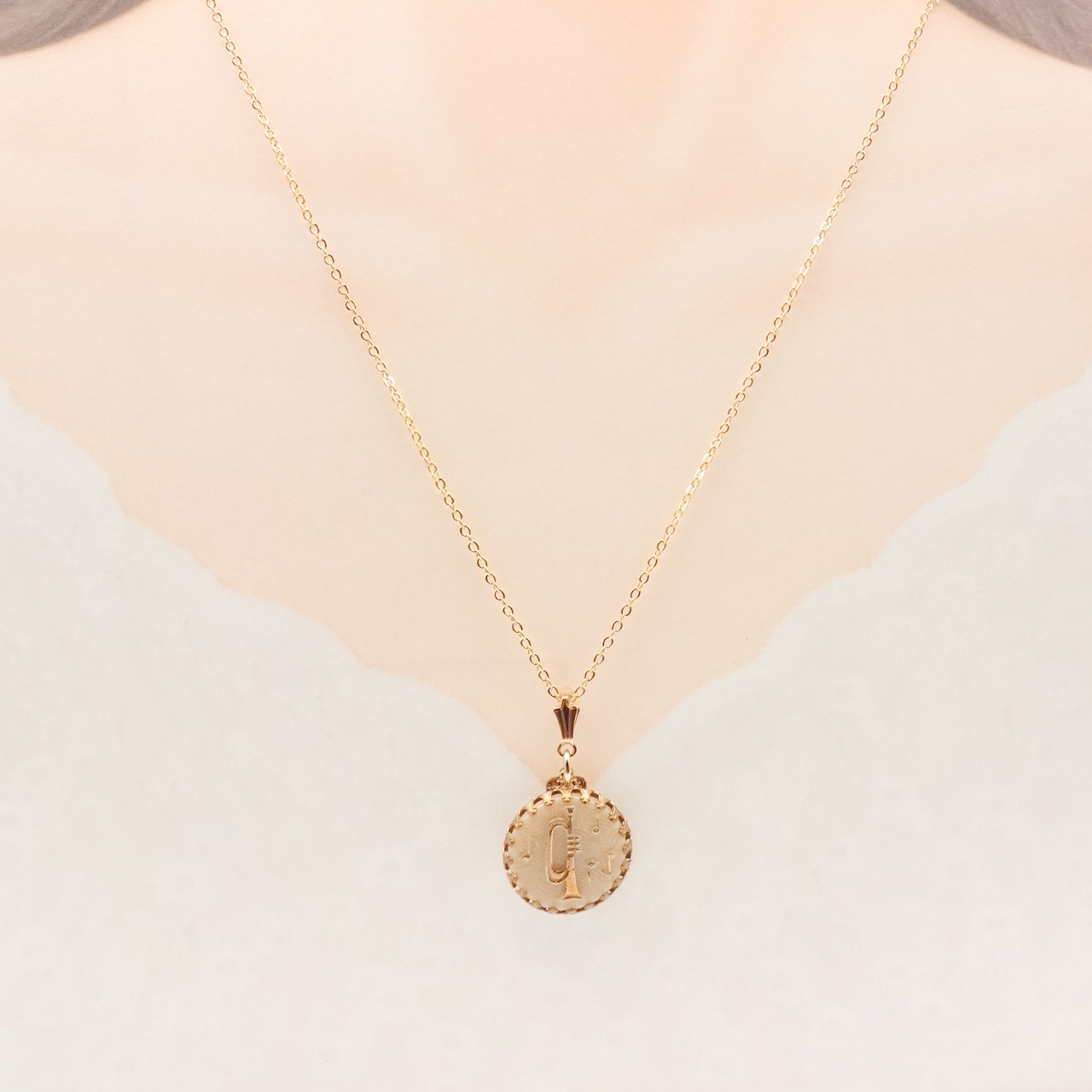 王冠のようなデザインのフレームに、トランペットと音符が描かれたヴィンテージガラスをあわせました。