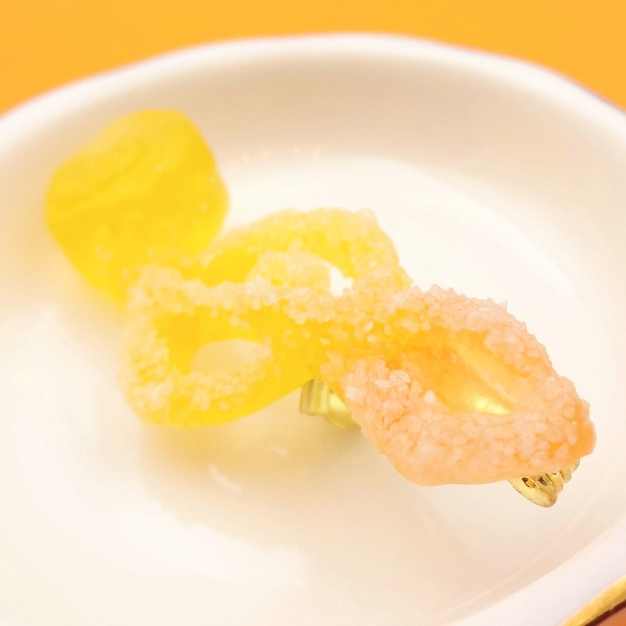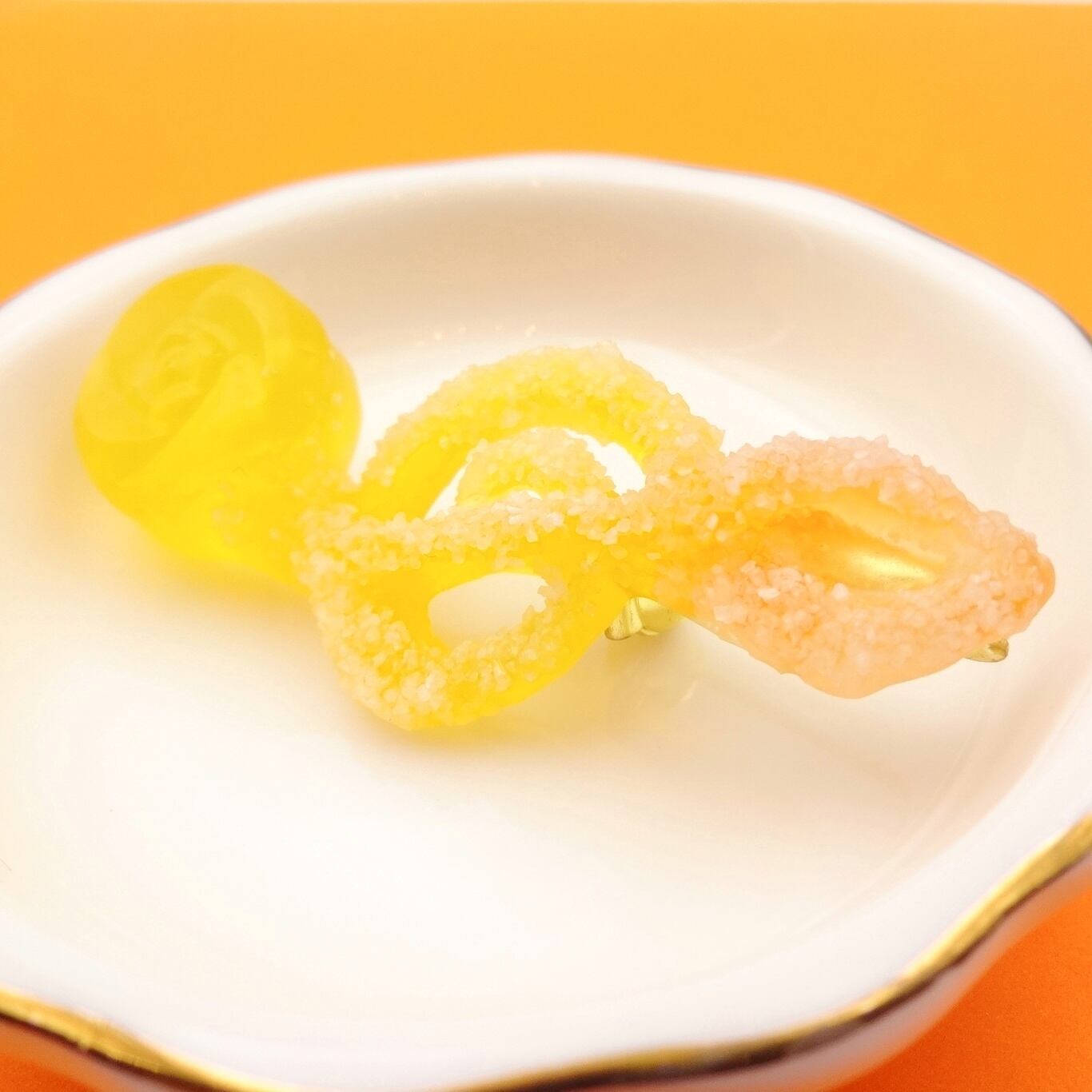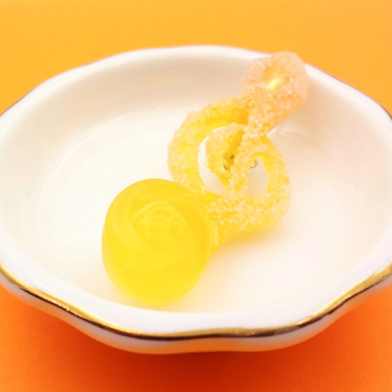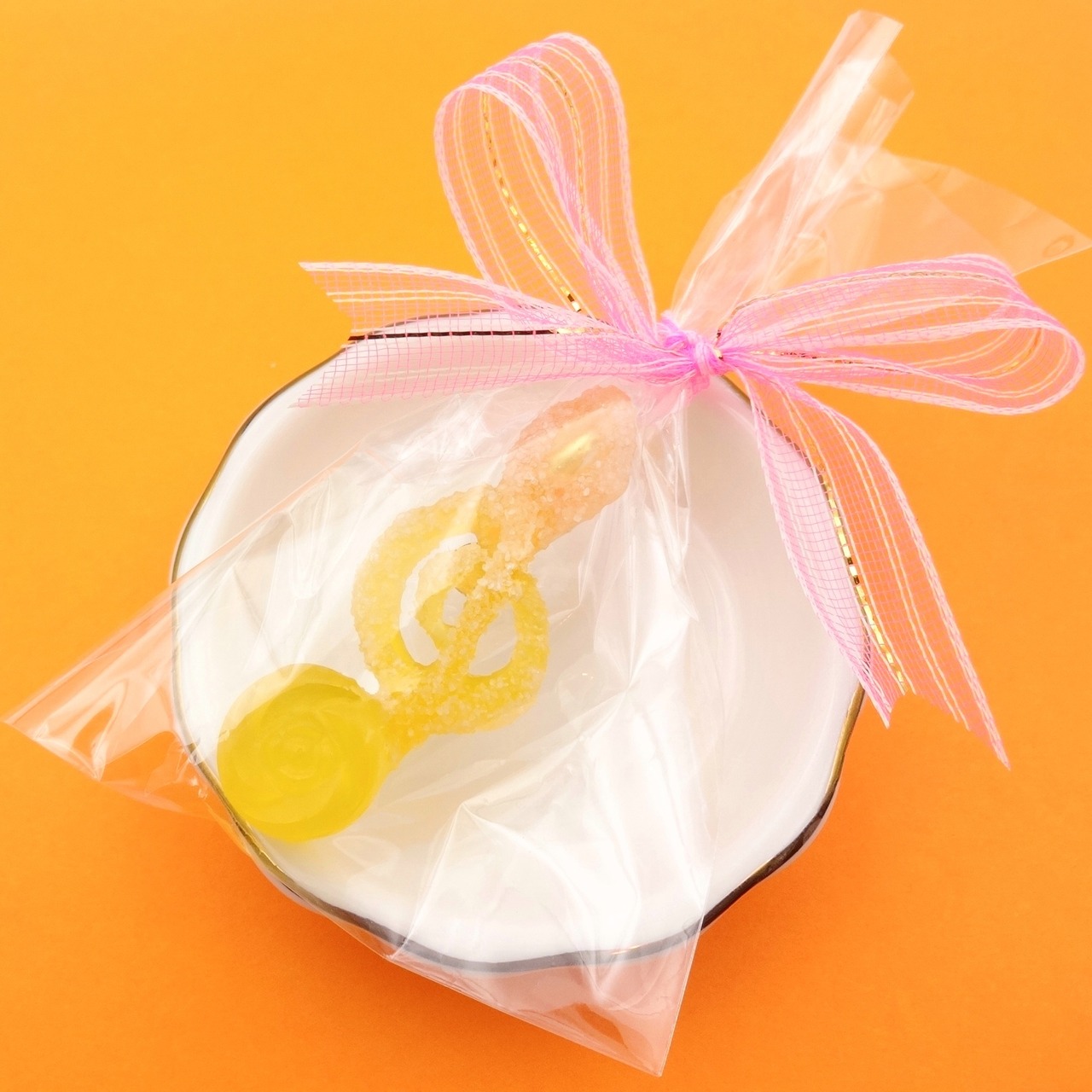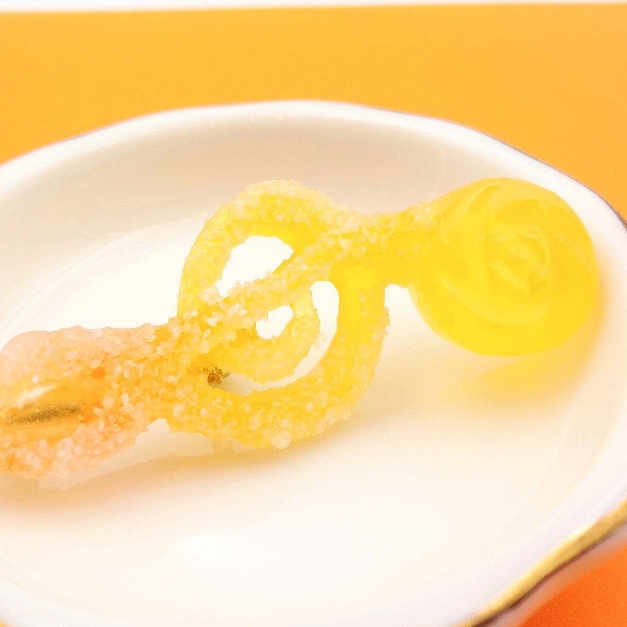 ジューシーなミカンとレモンのドロップを、楽しいト音記号の形に仕立てました。
