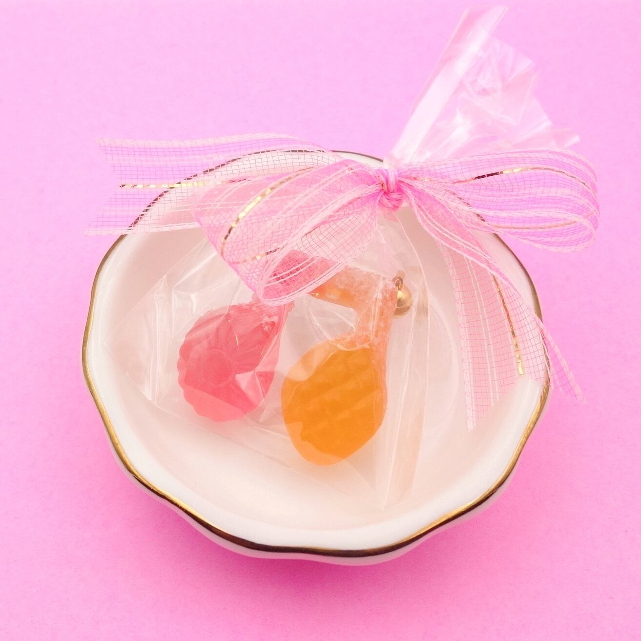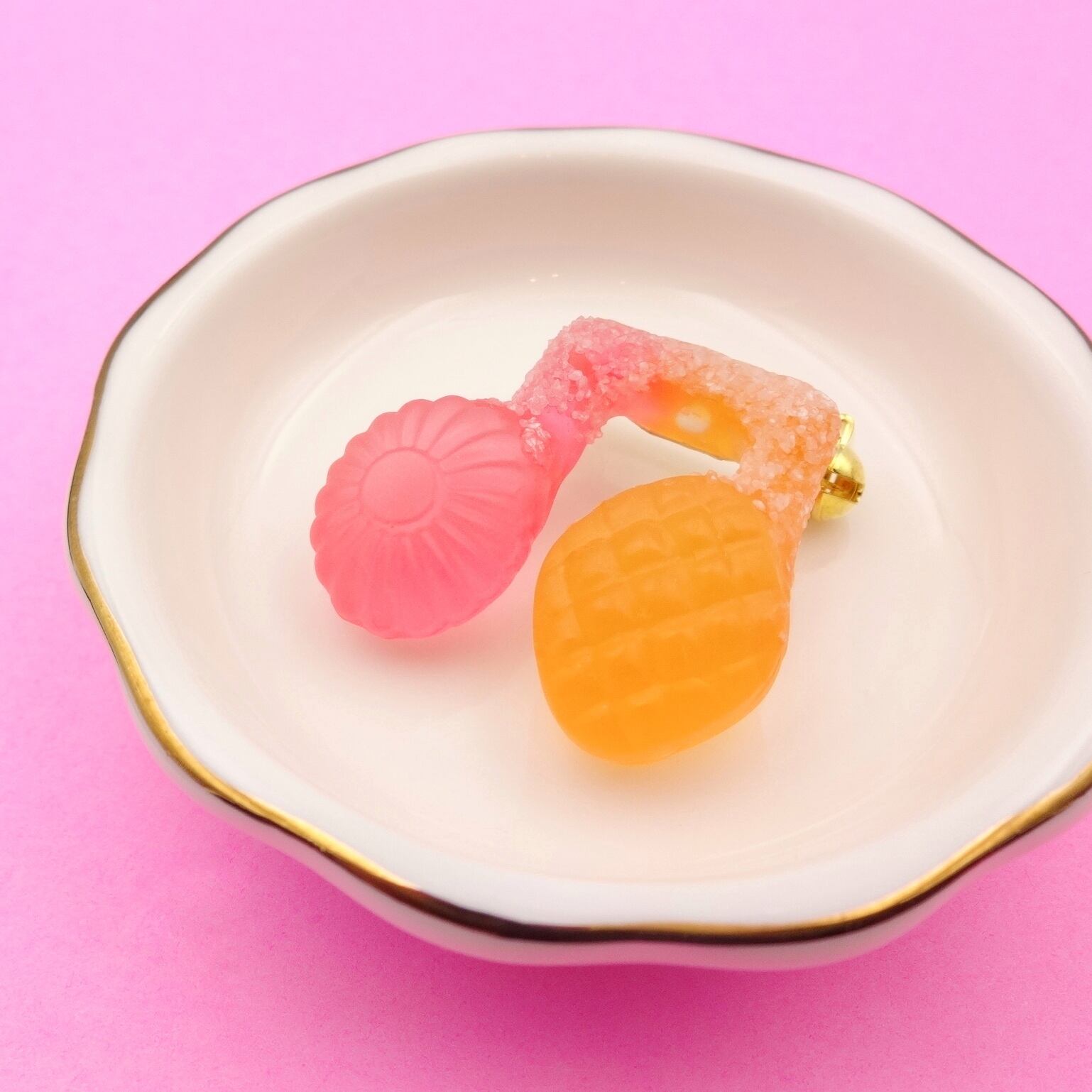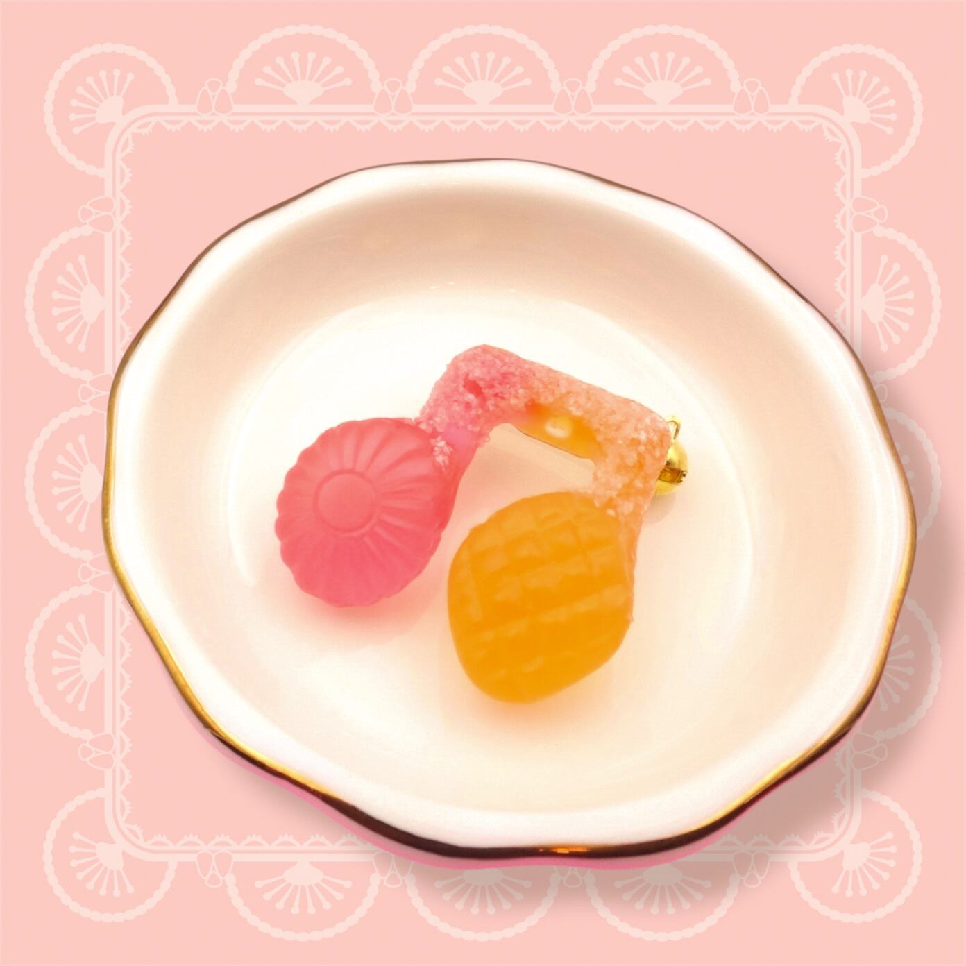 ジューシーなオレンジとイチゴのドロップを、楽しい音符の形に仕立てました。