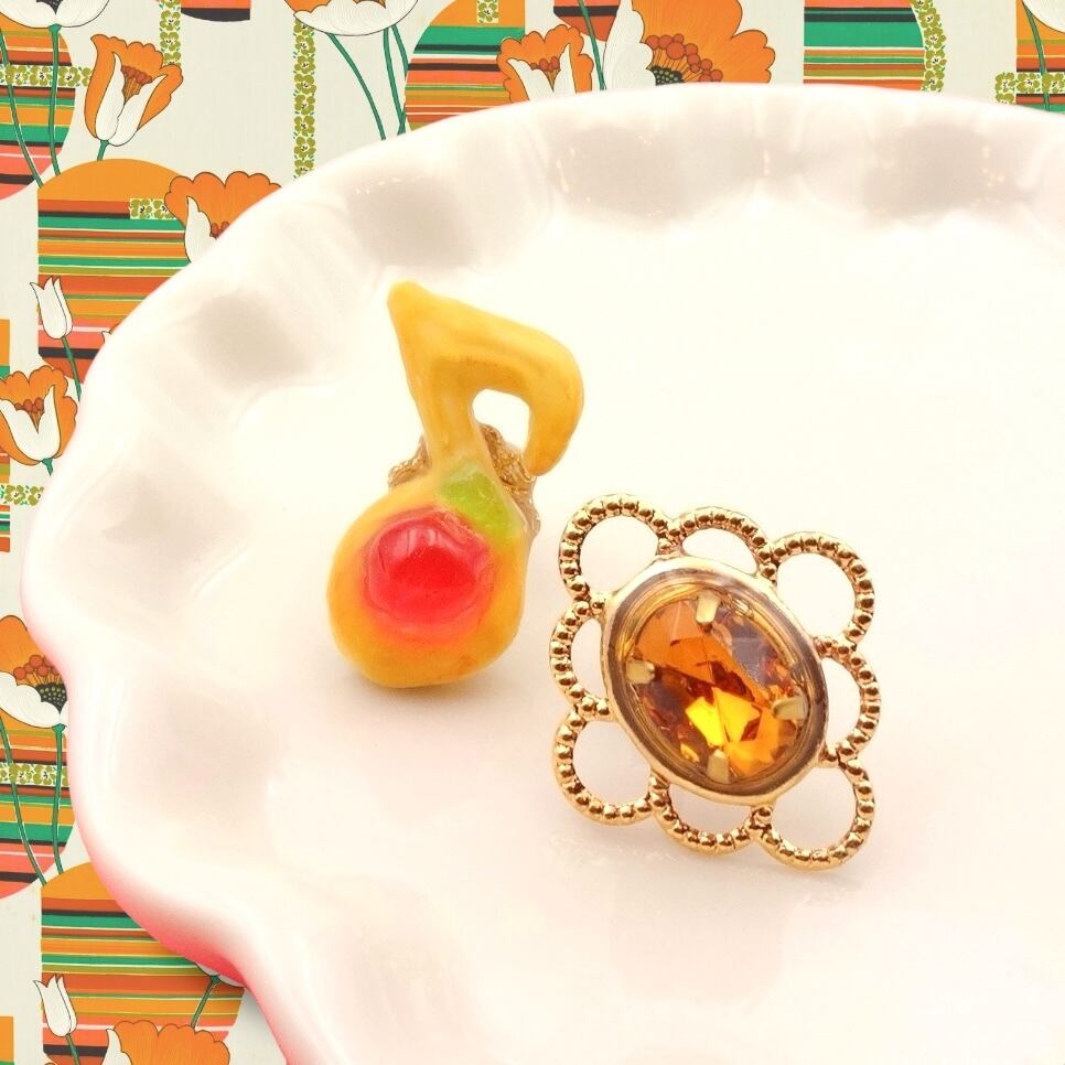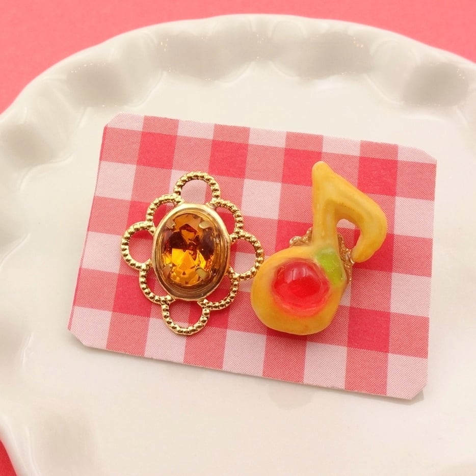 レトロな音符の形の、絞り出しクッキーと宝石の耳飾りです♪