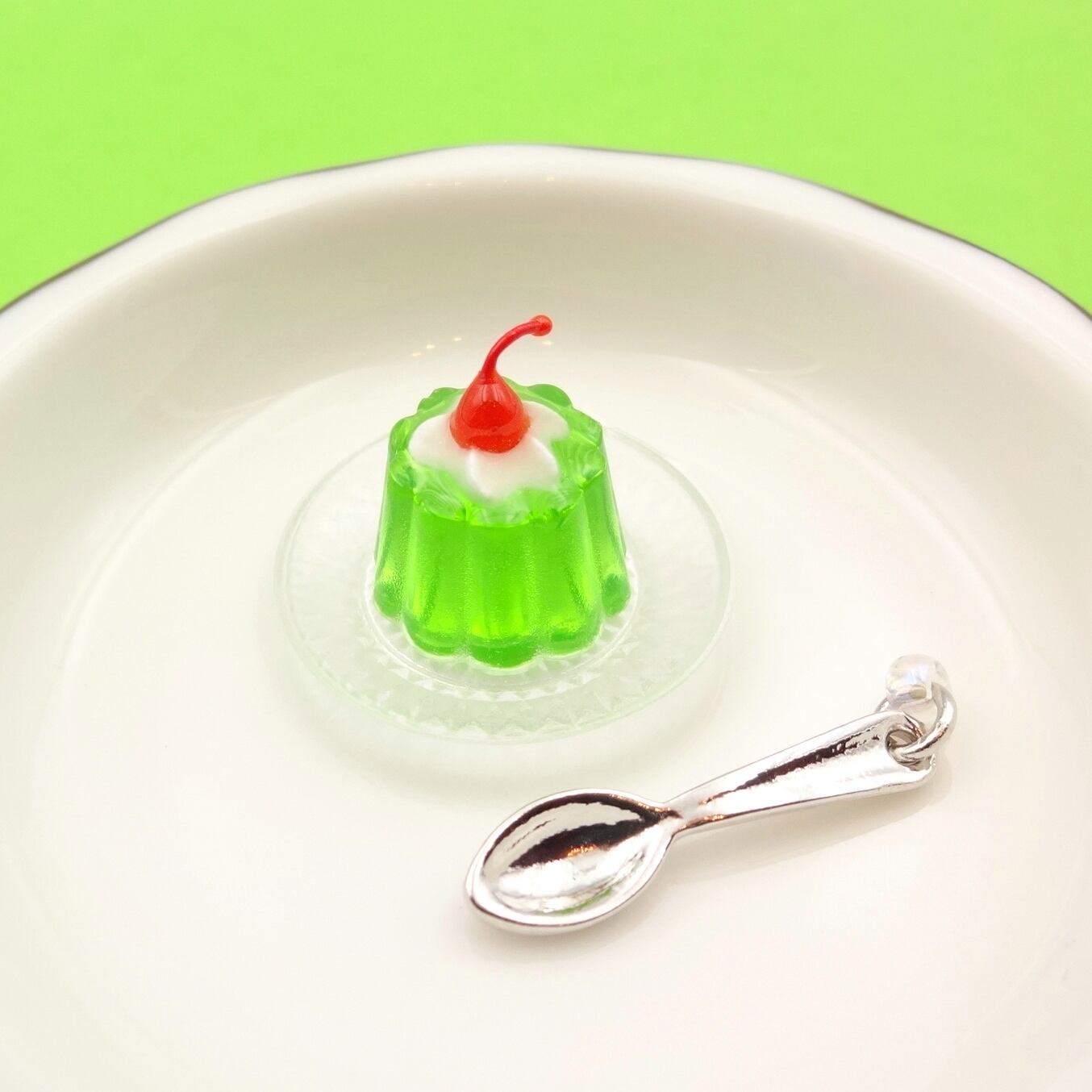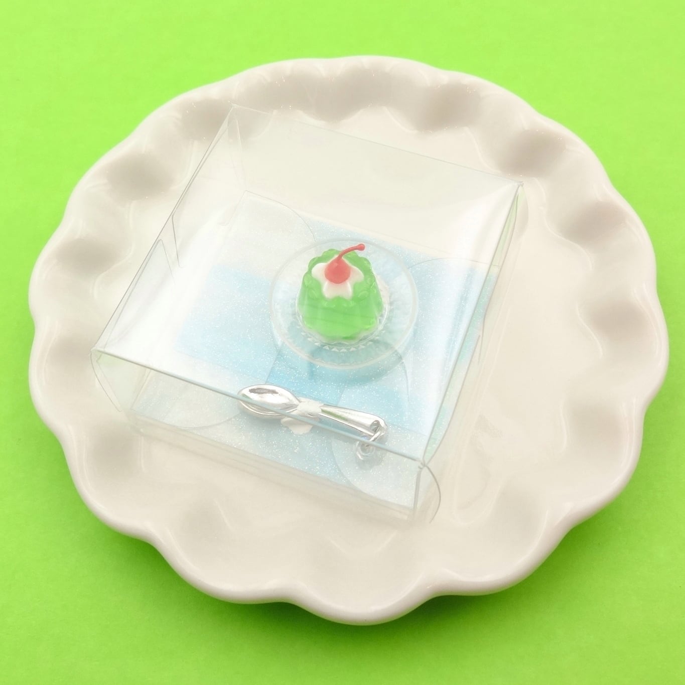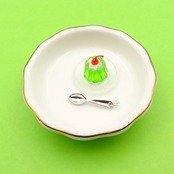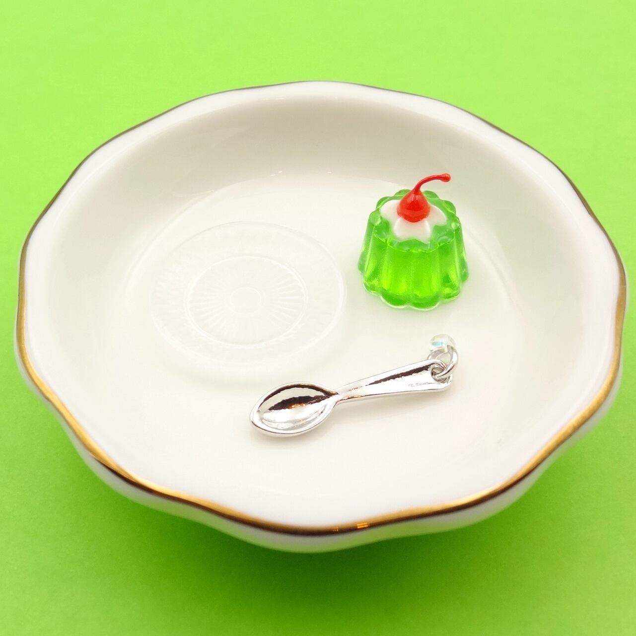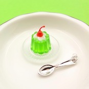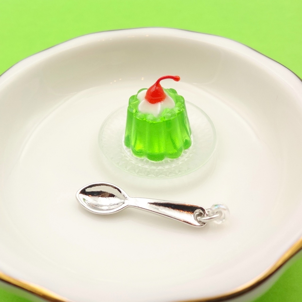 ミニチュアサイズのゼリー、レトロなデザインの透明のお皿、スプーンの3点セットです♪