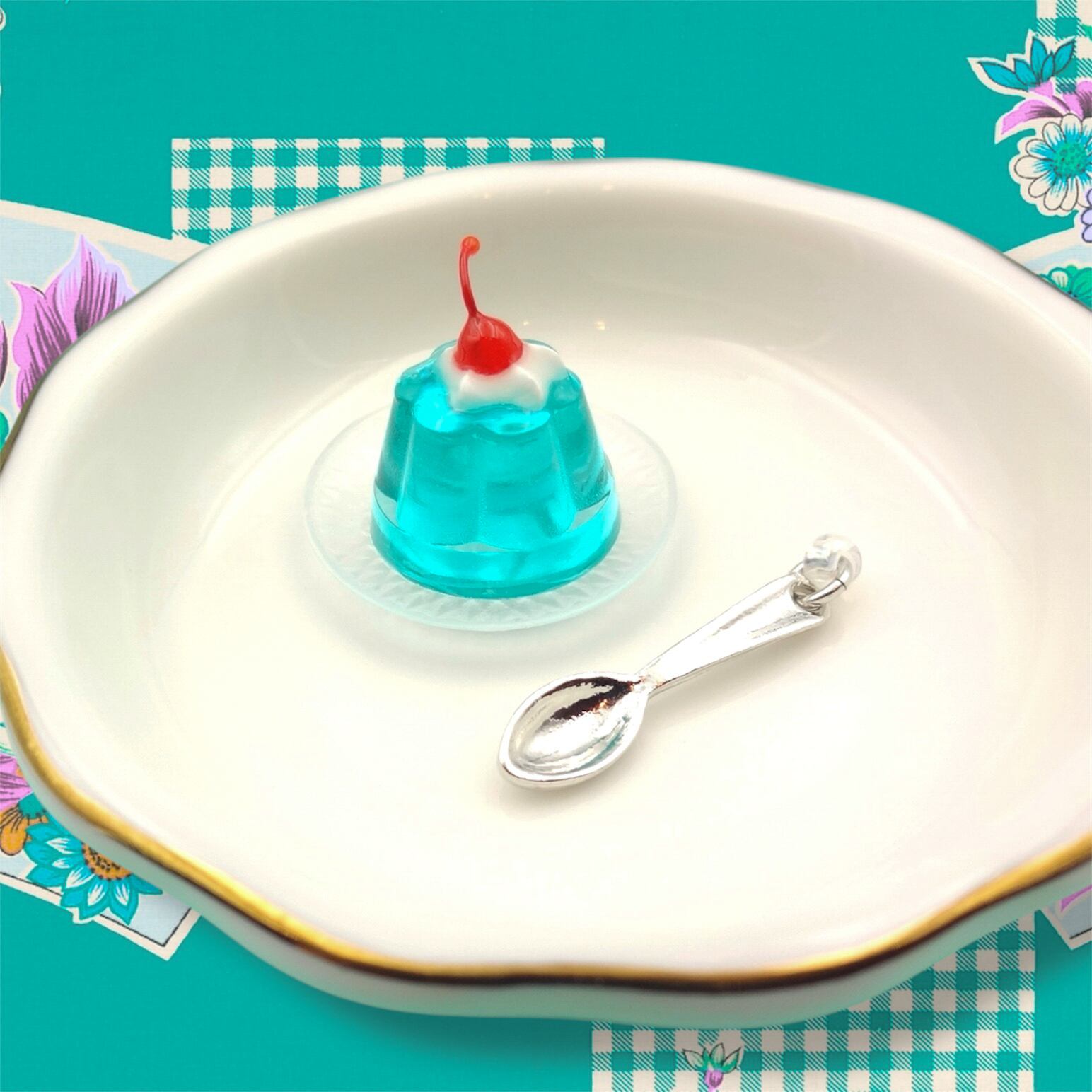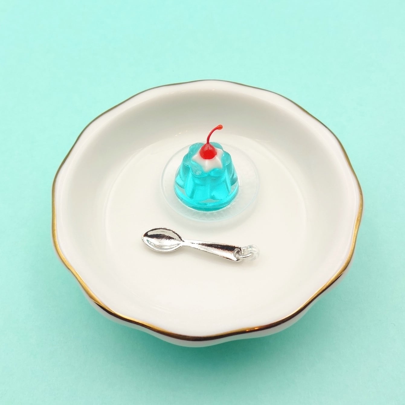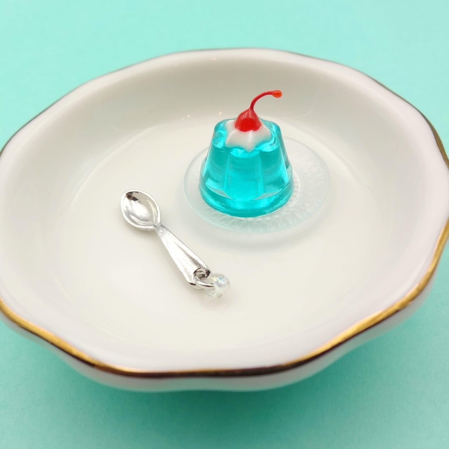 ミニチュアサイズのゼリー、レトロなデザインの透明のお皿、スプーンの3点セットです♪