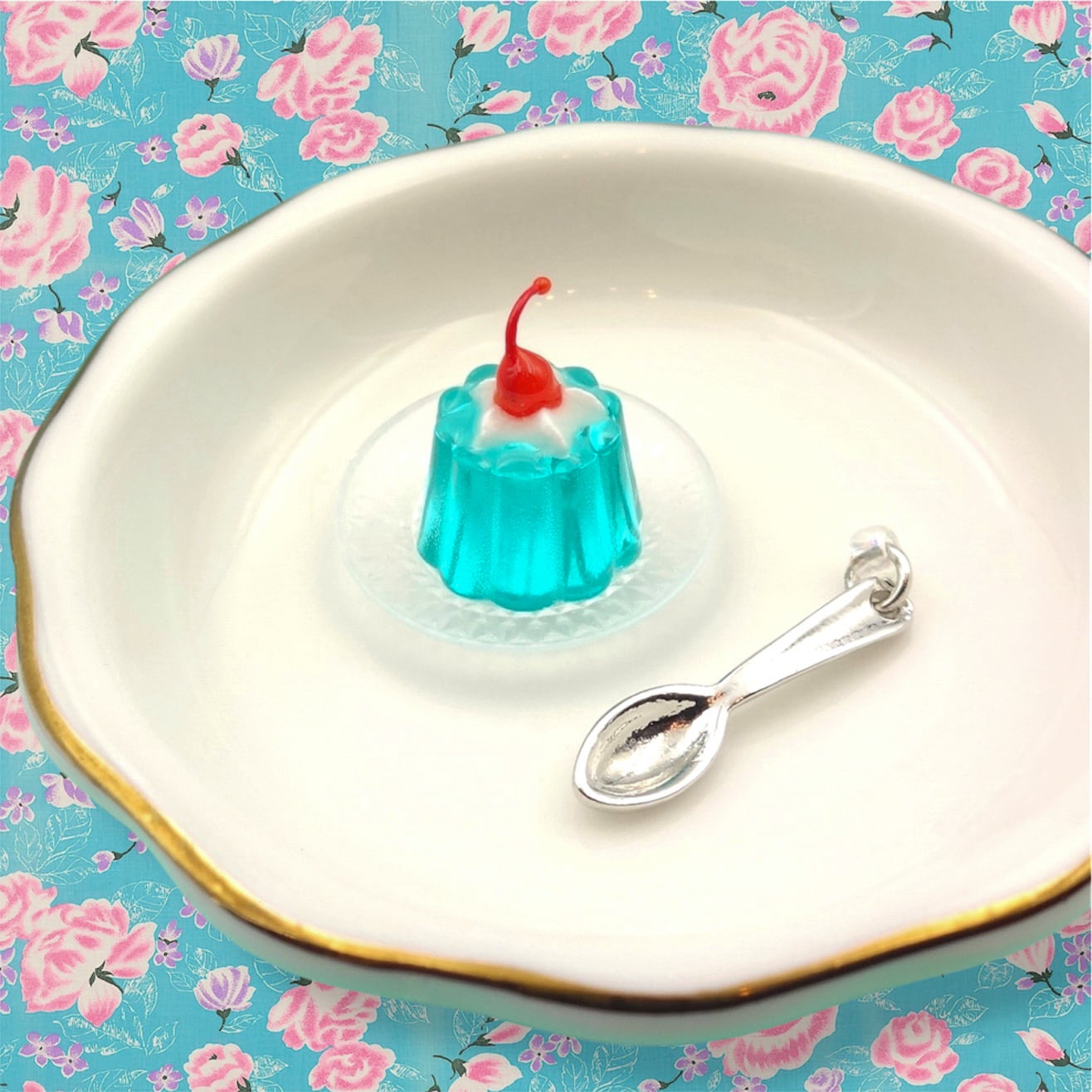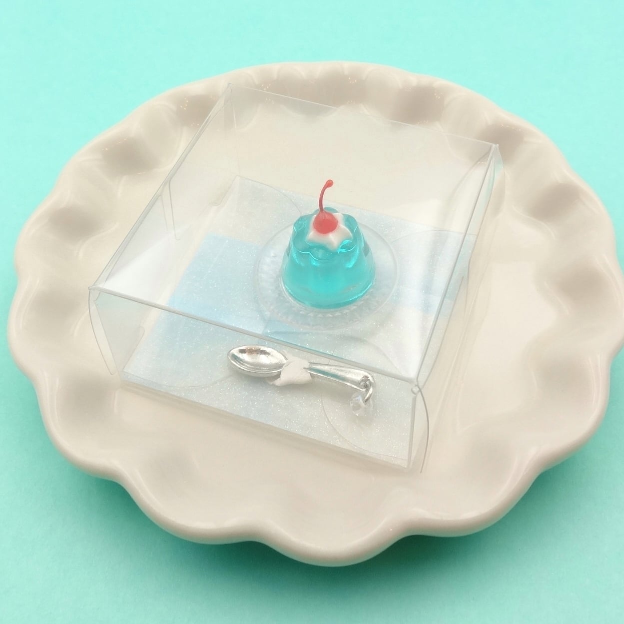 ミニチュアサイズのゼリー、レトロなデザインの透明のお皿、スプーンの3点セットです♪