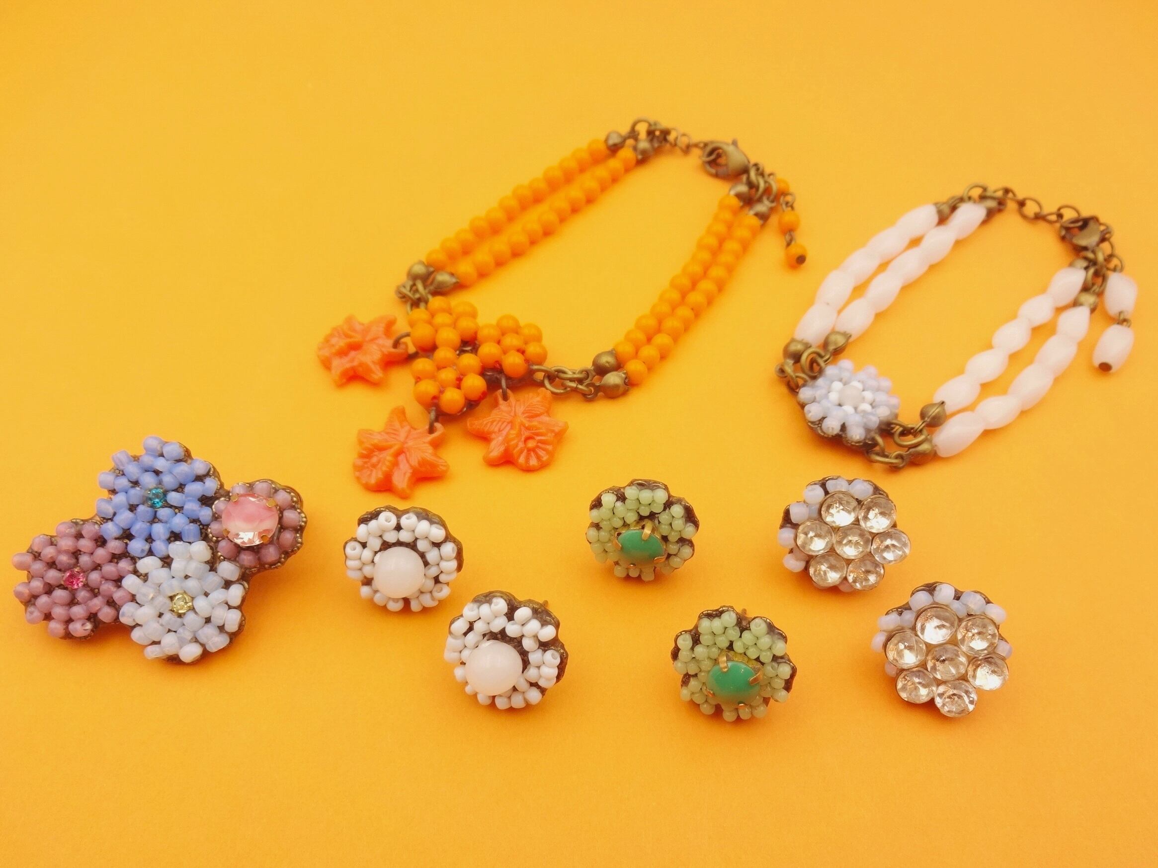 金具以外の全て、ヴィンテージのガラス・樹脂パーツ・ビーズを使って制作したコスチュームジュエリーです。