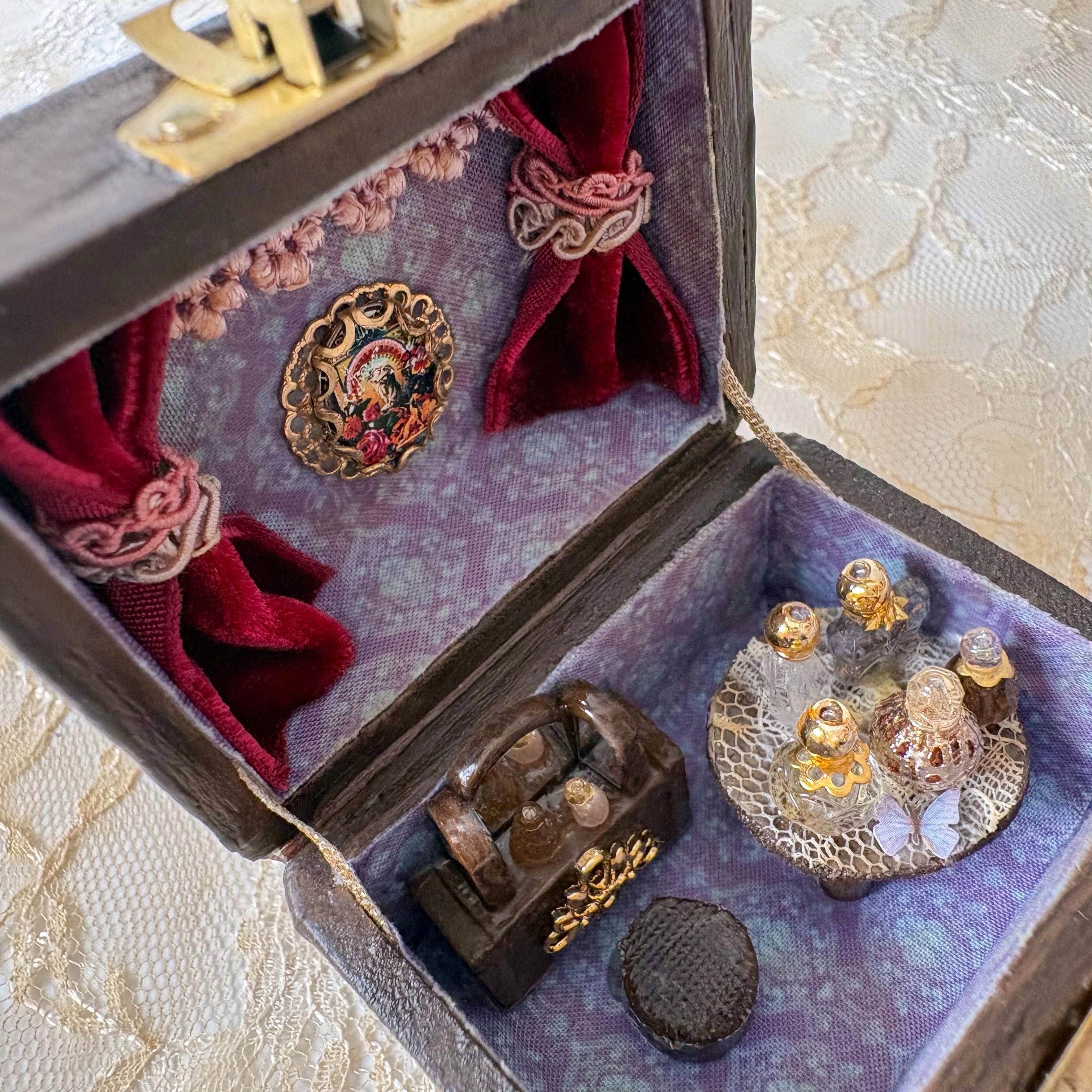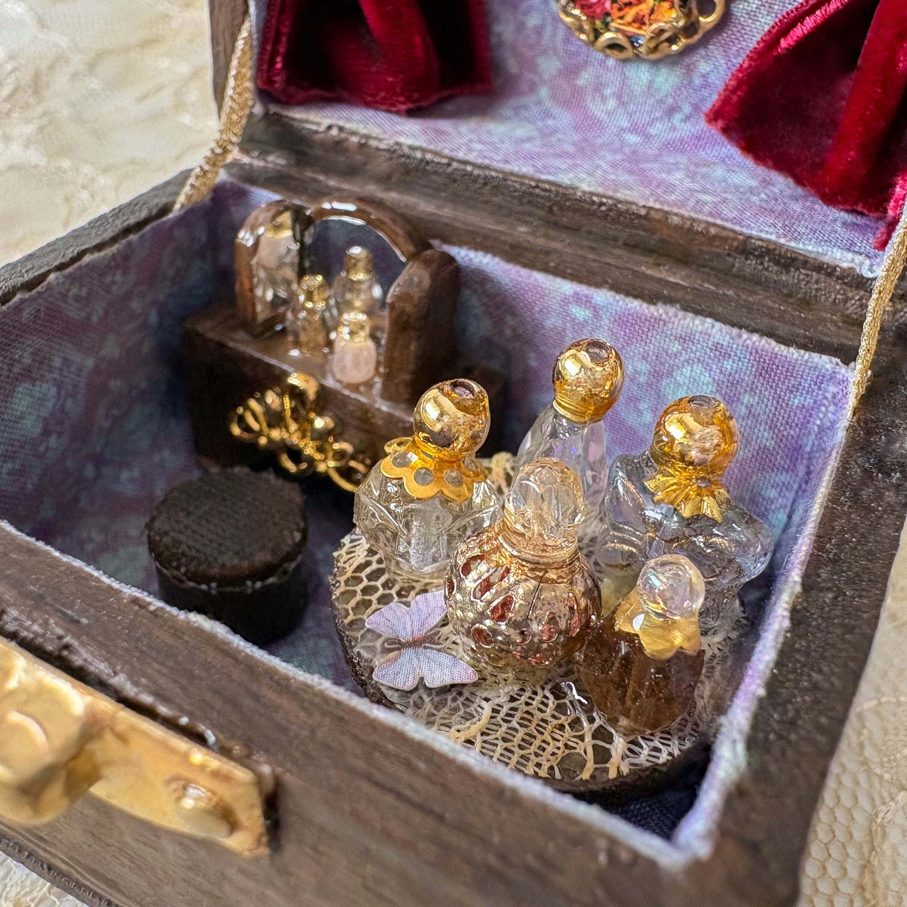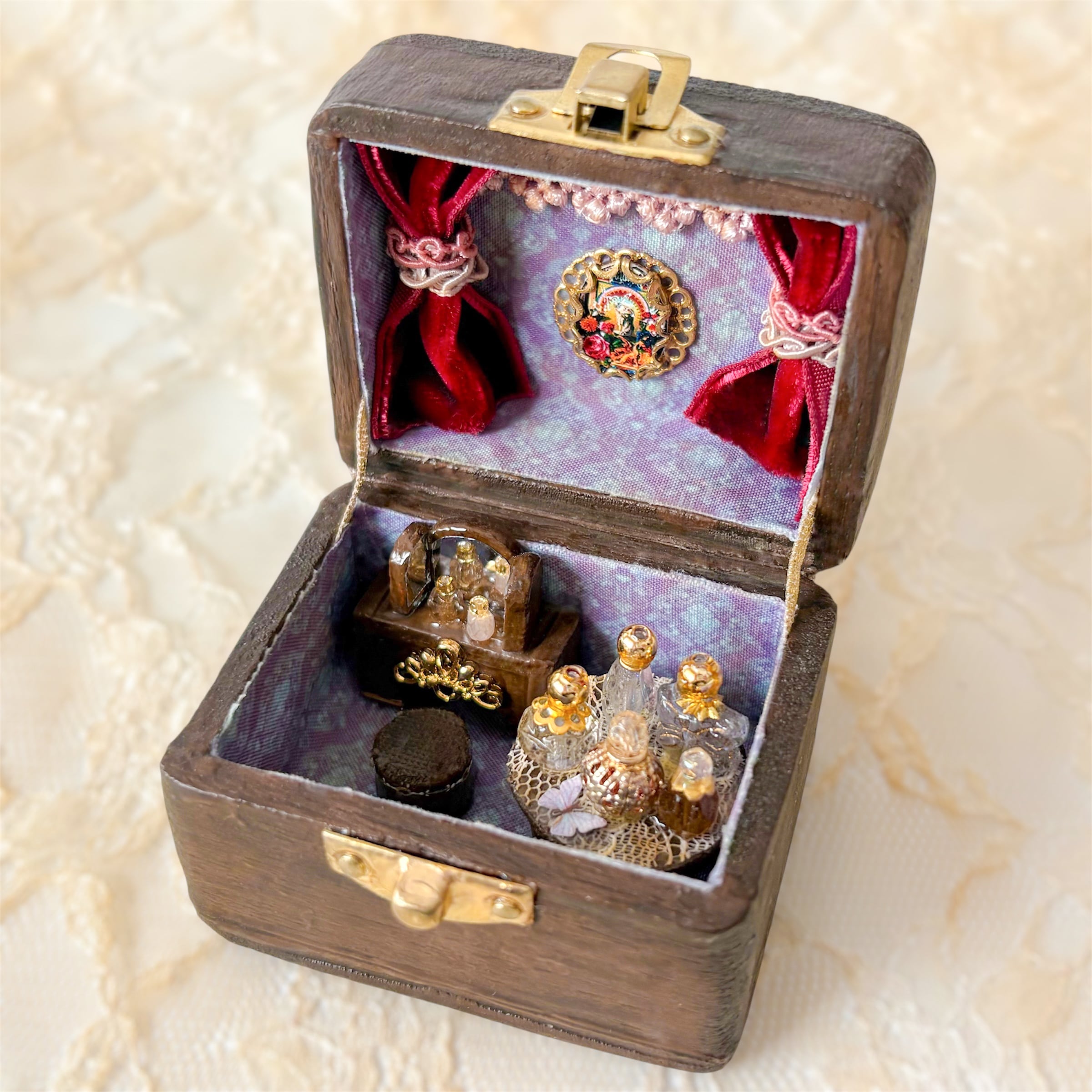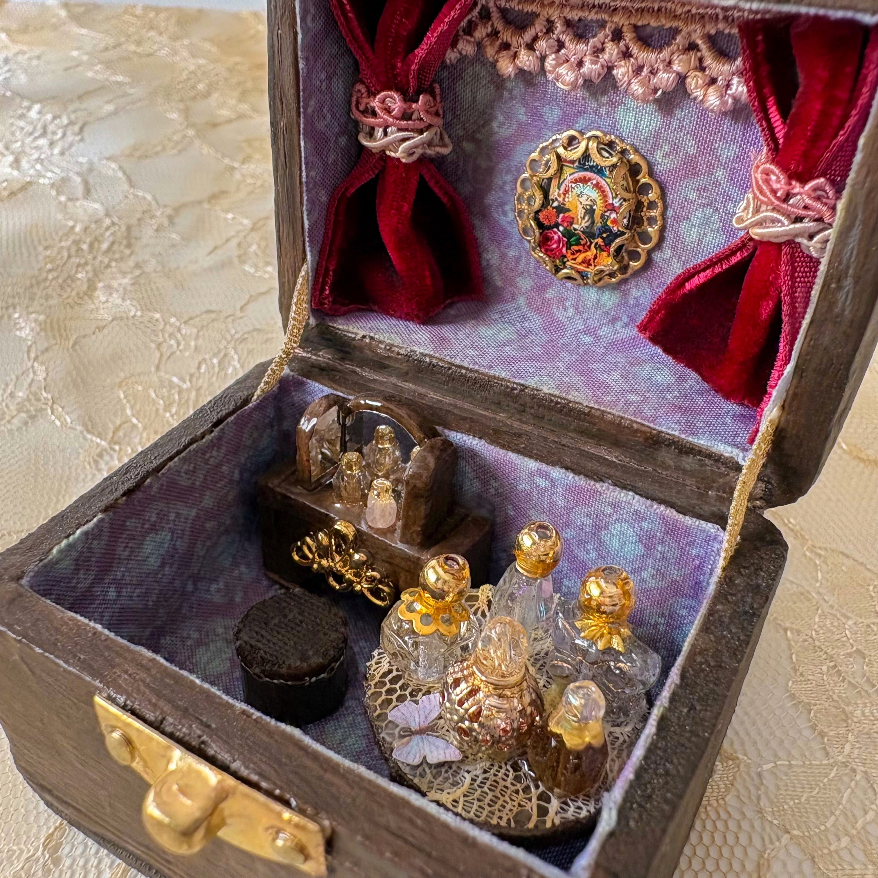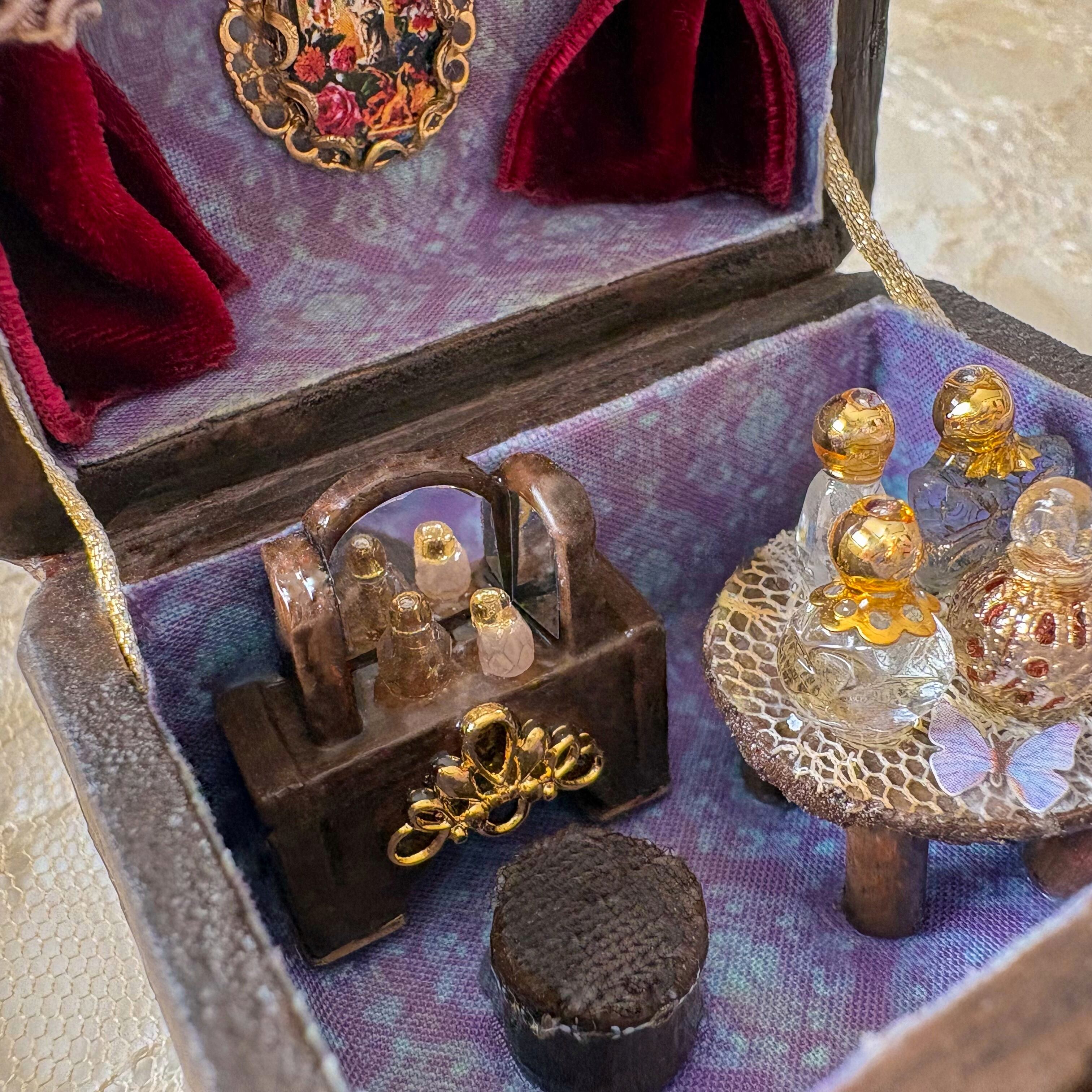 コンパクトのようなハウスを開けると、香水瓶や鏡のあるドレッサー。
