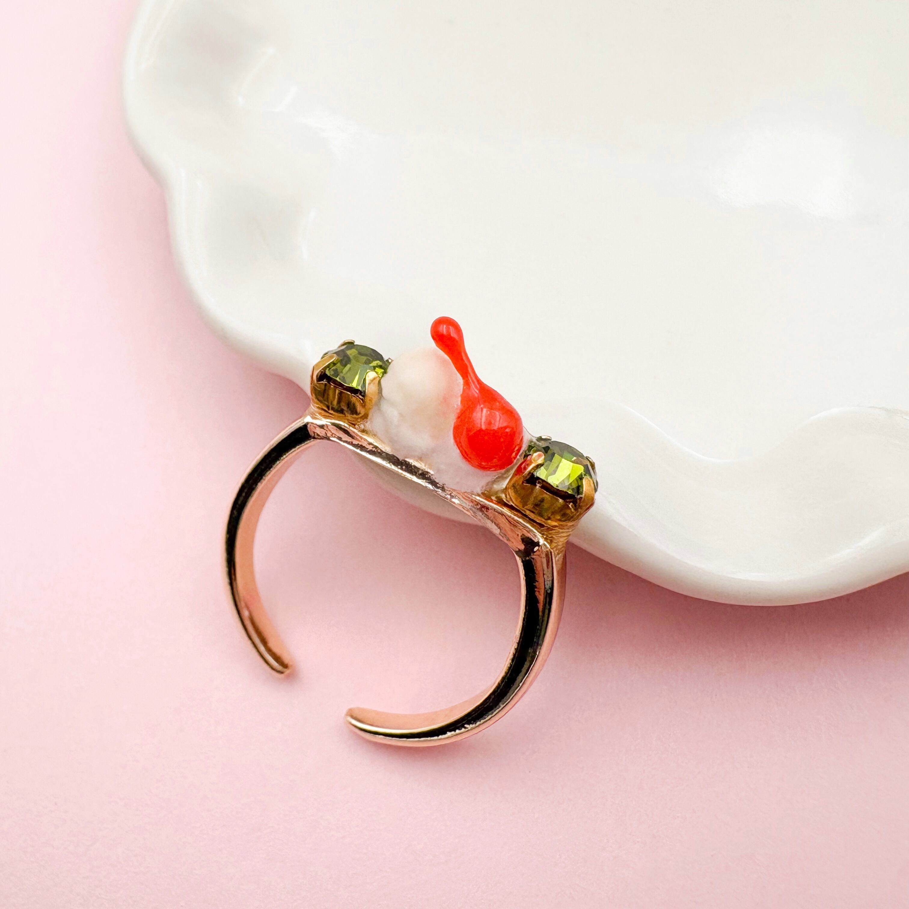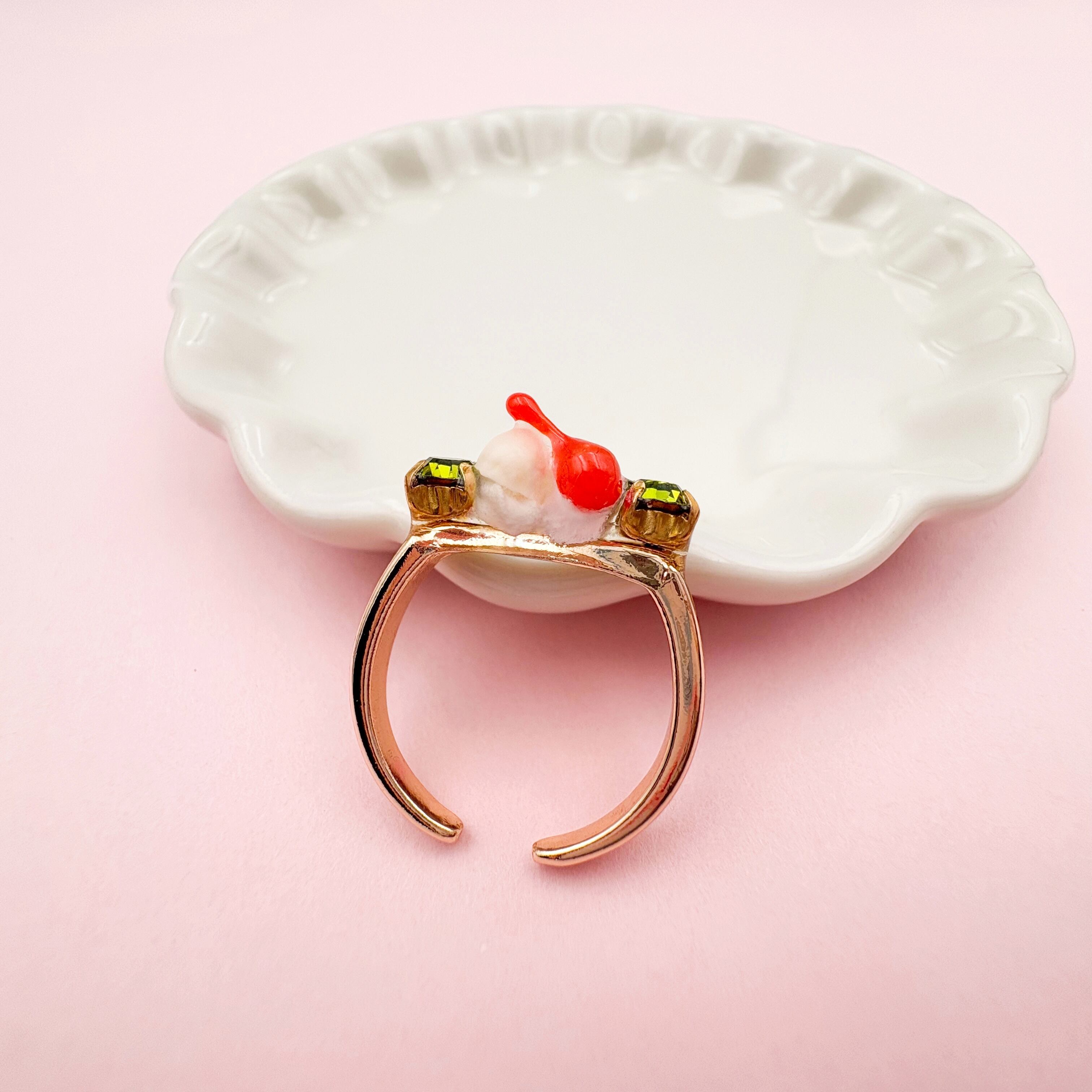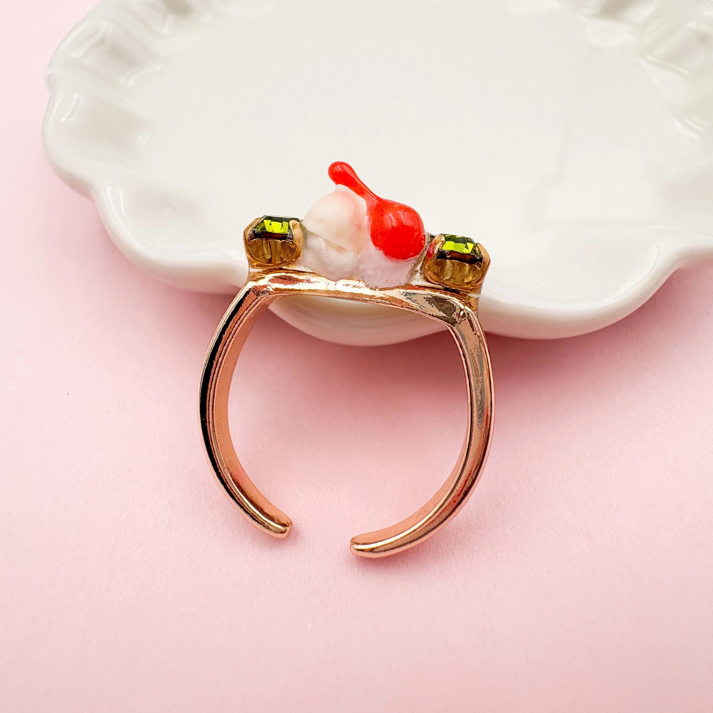 さくらんぼ、バニラアイスクリーム、メロンソーダ色の宝石(スワロフスキー)を並べて飾りました。