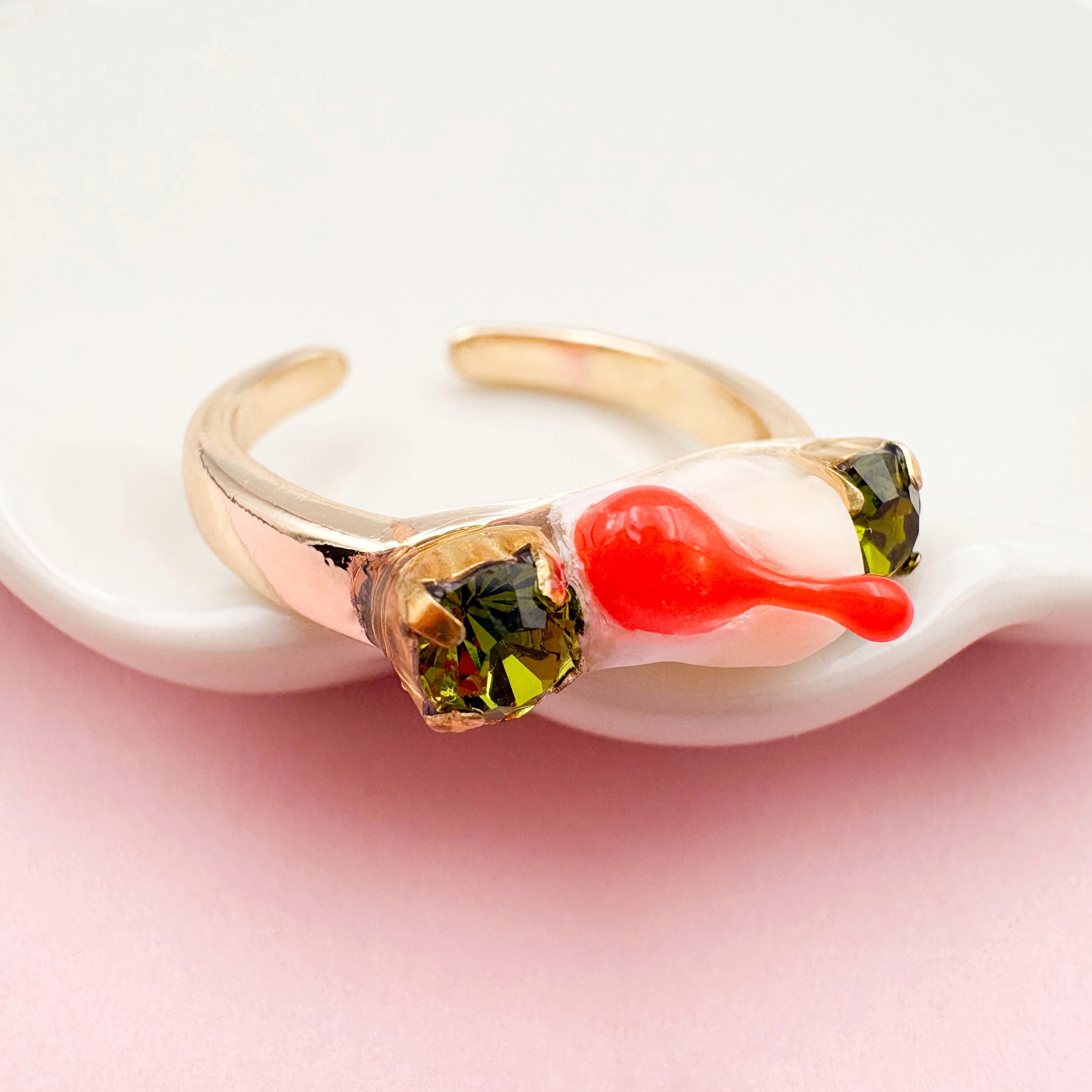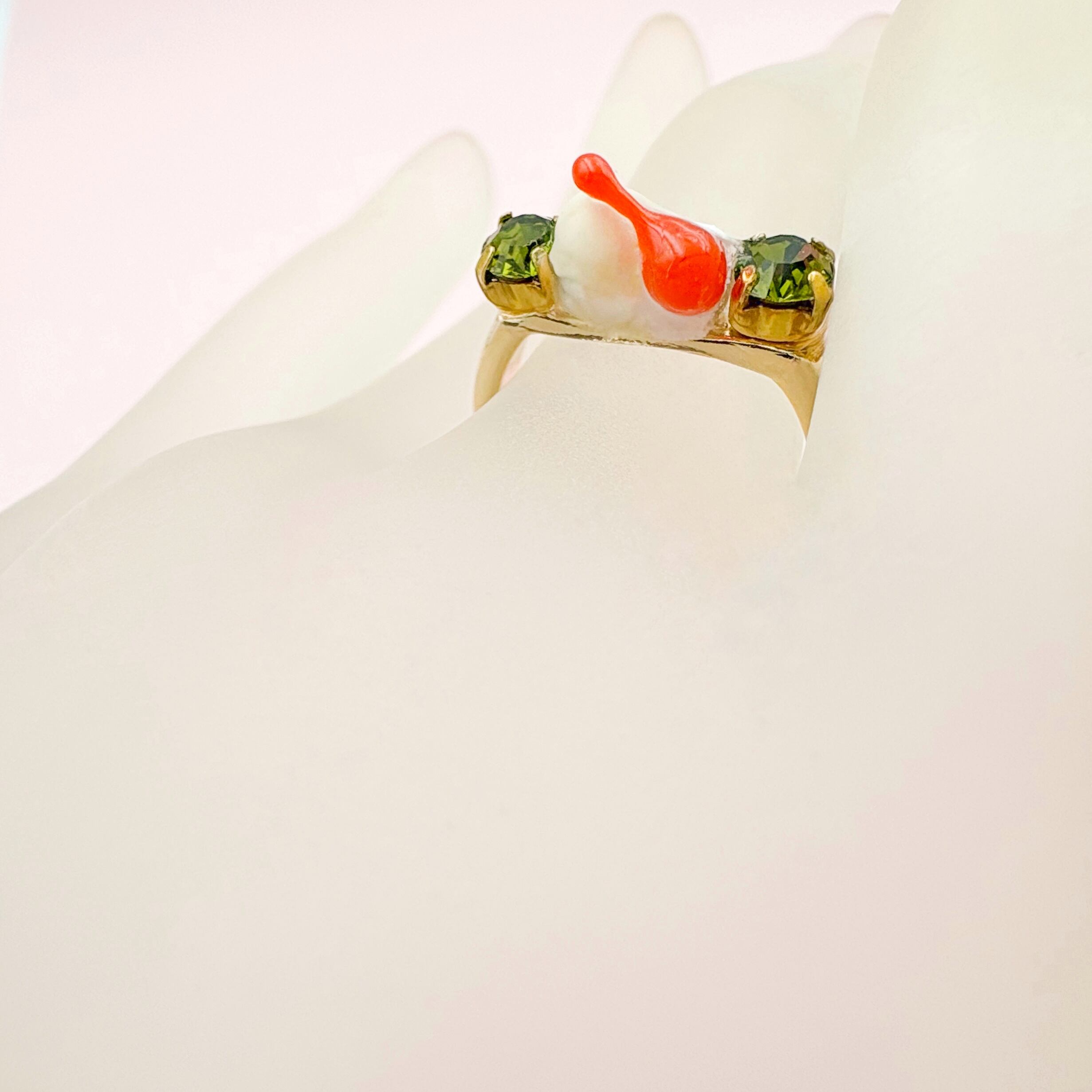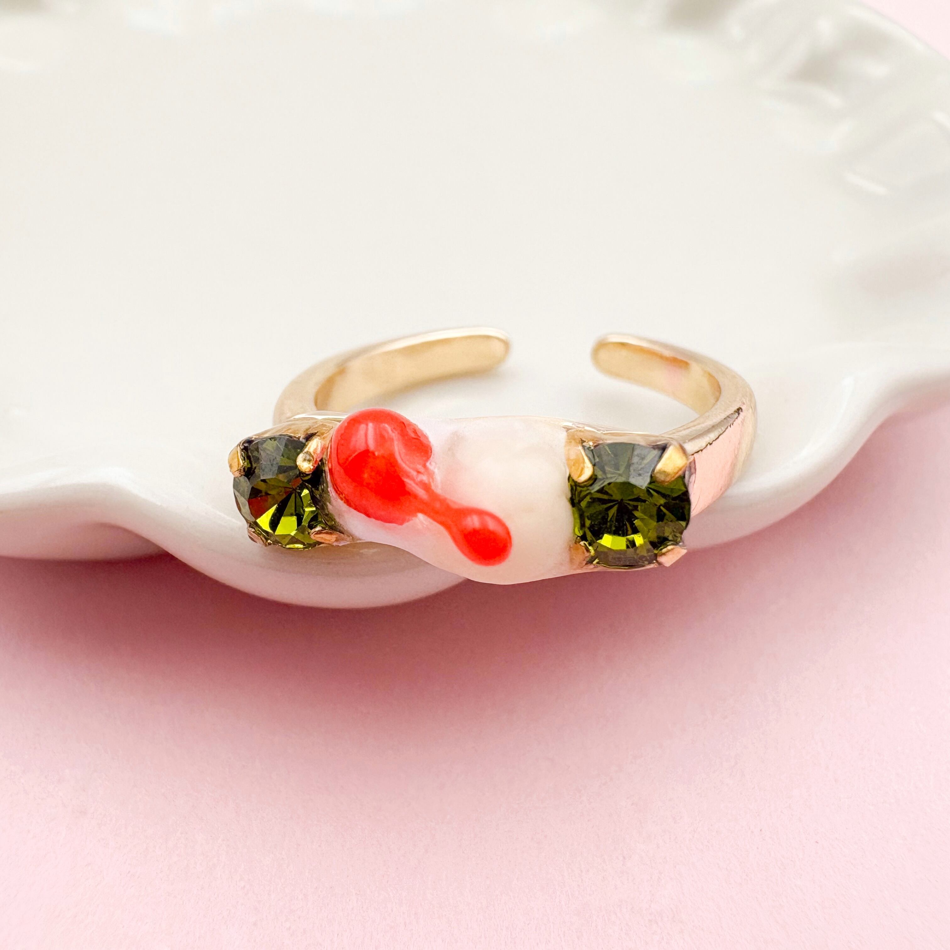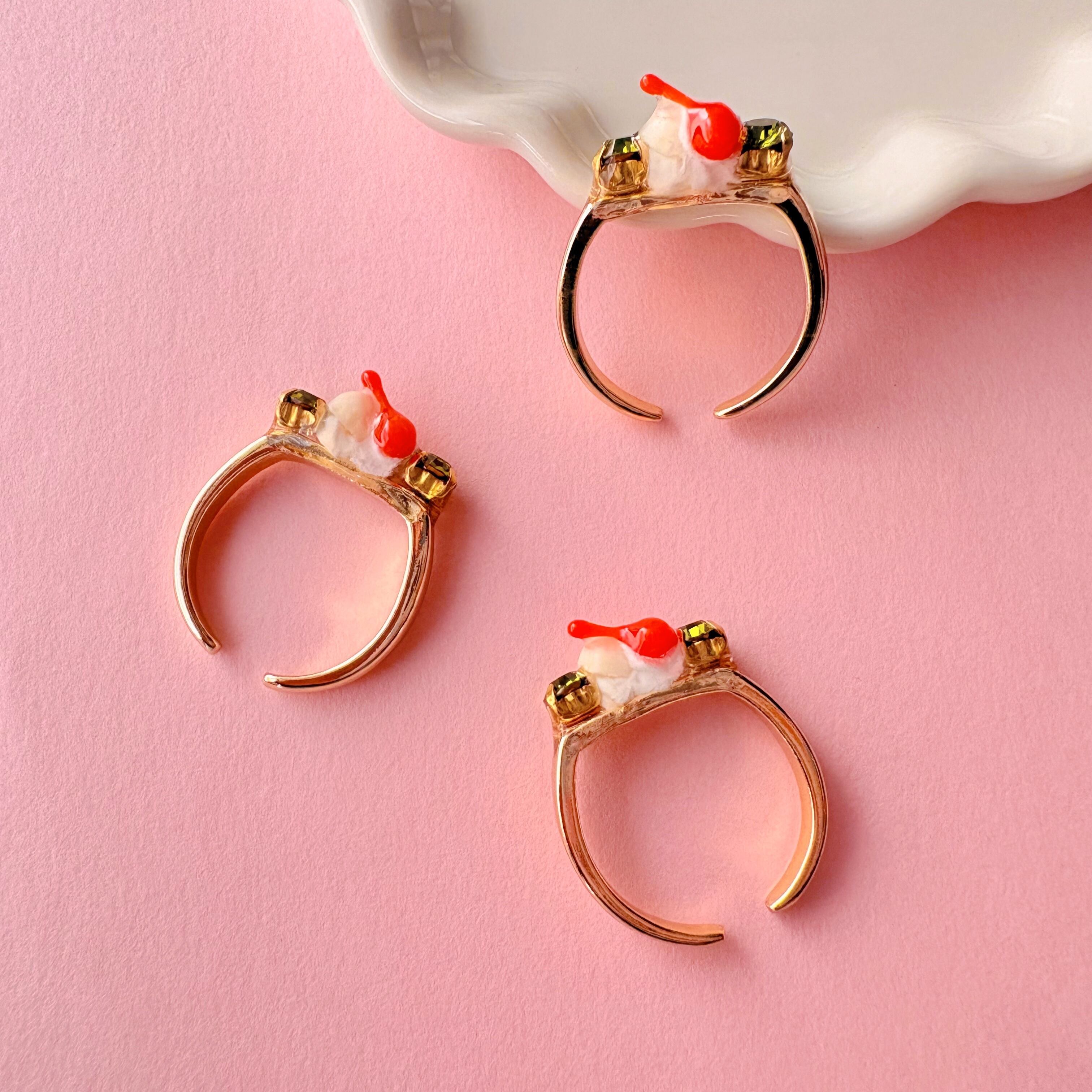 さくらんぼ、バニラアイスクリーム、メロンソーダ色の宝石(スワロフスキー)を並べて飾りました。
